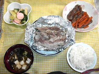 今夜の晩ご飯は5品で482.5カロリー豚のホイル蒸し材料3人分/1人分134カロリー豚肩肉 180gホウレン草 100g(ゆでる)シメジ 1/2株えのき 1/2株塩・コショウ 少々味ポン 大さじ3一番下に、茹でたホウレン草を敷いて、蒸し焼きにするので油要らずです。フライパンに少量の水を入れて蒸し焼きに。過去の「ホイル蒸し(焼き)」1/18、1/17、2/2←ポチッとな♪魚肉ソーセージの中華サラダ材料2人分/1人分89.5カロリーきゅうり 1本(80g)セロリ 2枚?(100g)魚肉ソーセージ 1本塩 0.5g(キュウリ&セロリを揉む)中華ドレッシング 大さじ1塩もみしたキュウリ&セロリにドレッシングを加えて和えるだけ…類似メニュー1/21←ポチッとな♪ピリカラ蒟蒻のめんつゆ煮材料2人分/1人分40カロリー唐辛子入り蒟蒻 1個(250g)人参 60g3倍濃縮めんつゆ 40cc水 300cc人参は適当な大きさに切り、蒟蒻を5ミリ幅に切って、真ん中に切れ込みをいれ、ネジる。(茹でてアクを取る) めんつゆと水で煮る。味噌汁材料2人分/1人分51カロリー豆腐 1/4丁(70g)カットワカメ 2g鰹ダシ 2g味噌 24gゴハン100g/168カロリー 本当はもう一品作る予定だったんですが…父上&母上が夕方やって来た時に、昨日焼いた「イチゴ練乳パン」を振舞ったんです♪で、吊られて私も食べちゃった((^┰^))ゞ テヘヘそんな訳で、一品減らしちゃいました~ 明日(もう今日だ!)は「抹茶小豆パン」に挑戦今からワクワクしちゃってま~す