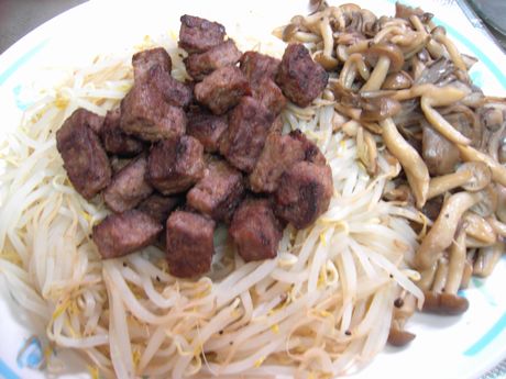 今日は給料日なので、ボリュームゴハン今夜の献立は先にUPした”鶏皮カリカリ豆腐サラダ”とワカメスープ。サイコロステーキ350gもやし 2袋(500g)結構な量です。しめじ1pまいたけ1p★モヤシはボイルしただけ。★キノコはマーガリンでソテー。で、肝心なステーキソースは手作りにんにくタップリの和風ソース材料にんにく 5片たまねぎ 1/4酒 150cc醤油 50cc味の素 少々砂糖はタマネギの甘さが足りなかったら入れる。★ニンニクとタマネギは細かく切って、酒と醤油と一緒にミキサーにかける。★鍋で、濃い目の味になるように煮詰める。★砂糖と味の素で味を調える。この量だとちょっと多かったです。 豆腐サラダとこのモヤシで、を食べなくても満腹口もトイレもニンニク臭プンプンです(笑)美味しかったよん。 お給料ありがとう今月もお疲れサマでした<(_ _)>