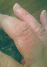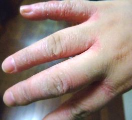 8/1に受けた採血の結果が出た。抗ACHR抗体値49やっと40代まで戻った先月は53だったので5下がっただけだけど、上昇する事無くやっと2007年01月の数値まで戻る事が出来た。2006年11月(退院直後)は抗体値30代だったので、そこまで戻るのはまだまだだけど、白衣王子が「抗体値が高いから重症という事じゃない。0.5しかなくても歩けない人もいれば100以上あっても普通に暮らしてる人も居る。だから抗体値が全てではない。」といつも言う。その通りだと今回は実感した。なぜなら、先月上旬まではそんなに感じなかったけど、シャンプーや歯磨きや髪を梳かす行為が努力は要すけど、苦で無くなったからだ。それに、2006年末の抗体値が30代だった頃は「首」を支える事や「瞼」が下垂するという日常生活で困難な事が多かったけど、今は全くと言って良いほど、その症状は感じない。「ものもらい」は相変わらずだけど…対策として、抗菌点眼薬を朝昼晩欠かさず点眼。日中の外出はサングラスこの効果か、連続してものもらいになる事が無くなった。あと、ステロイドの減薬で皮膚疾患が出てきた特にひどいのは右手の指。1週間ほど前から、赤くなり指の間から爪の付け根まで皮がボロボロ剥ける。痒くて痛い湿疹なのか真菌性のものかハッキリしないけど、真菌性による感染症の可能性が高いので「ラミシールクリーム」を処方してくれた。この画像はクリームを塗って2日目。画像じゃ分かり辛いけどまだザラザラと皮がむけている。このクリーム、すぐにサラサラと乾いてしまうので水仕事の後はワセリンを塗って剥けた皮をなじませている。顔や背中も痒い。痒くてたまらないステロイド…減ってまで新たな副作用9/1、採血&診察。この日まで体調順調なら、さらにステロイド減薬。隔日20mgとなる。期待はしないと自分に言い聞かせているものの、夢にまでみた20mgだ。私の中では大きな区切りであり、夢のスタートが切れる量。順調にいって欲しい…