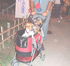 とっても暑かったけど、昨年も行った「サマーフェスティバル」へ行って来ました相棒は冷蔵庫でキンキンに冷やしたビールを持参です(笑)祭りの様子は昨年(07’08/03)(07’08/04)とあまり変わり無かく、とにかく人・人・人 カートに乗った「かりん&れもん」は大人気です「かりん」はまだまだ人見知りだけど「れもん」はすぐに誰にでもペロペロ珍しく「かりん」も知らない人にチュッ子供たちに囲まれて、揉みくちゃにされた時は思い余って「ウゥ~ワンッ」しちゃったフランクフルトと焼きとうもろこしを食べたよ今年オープンしたばかりの動物病院も出店してました。ペット用の栄養ドリンク1500円が600円で売ってました。無闇に買うわけにいかないんで成分チェックローヤルゼリーコラーゲンビタミンCビタミンB1やその他ビタミン郡1ビン30mlで30カロリー夏バテ防止に1箱買おうとしたら、もうお祭りも終わりの時間だったので1箱おまけしてくれた製薬会社の製品だけど、原価いくらなんだ(笑) お祭りから帰る頃、「かりん&れもん」はかなりお疲れでした。おうちに帰って「栄養ドリンク」飲んだよ
