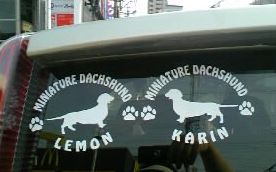 DOGステッカー ドッグシルエット切り抜きシール TYPE3 103犬種 ペットネーム追加無料ダックスのスムースがあったので、即購入スムースのシルエットがあるのは、本当に珍しいデスカラーもフォントもそれぞれ8種あってとっても悩みましたが、オーソドックスなホワイトにしました。右向きと左向き(反転)を1まいずつ、それぞれ名前を入れてもらいました対応もスピーディで、練習用のステッカーまで付けてくれましたよ~。貼り付けたのは土曜なんだけど、写真を撮ったのが遅かったんで今日お披露目しまーす本当は下部に貼りたかったんだけど、ワイパーに引っかからない場所を探したらココになった。中々イイ感じで、気に入りました他にも色々あって何枚も欲しくなっちゃったけど、あんまり貼るとゴテゴテになっちゃうんで2枚で我慢(笑)社名とか大きいものもやってるそうです。興味のある方はデザイン工房SIGNS でどうぞ-----------------今日は何日分の日記更新したかな~病院行って、簿記行って、組合費を班長さんに届けに行ったり…働いてないくせに何だかんだ忙しく毎日が過ぎてしまいます。最近は23時頃布団に入って0時前には寝てしまうので、余計にブログの更新してる暇が無いですでも今日は頑張って数日間の更新をしたので、お暇な方はお目通ししてみてね8/6フィラリアの薬をもらいに行って来ました。8/6婦人科から転院を余儀なくされた。8/7簿記講習8回目8/8犬連れ夏祭り8/10お買い物/餃子作り8/11抗体値48まで下がった!以上デス。7/20・21の追加旅行記はやっと写真のサイズ変更が終わりました…今日はもう寝るので、明日か明後日にはお披露目できそうかな