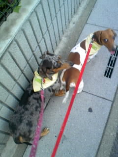 夕方になってもダックスには地熱が暑いですね~昨日作った、名前と自宅&携帯の電話番号と鑑札NOを「布プリ」したバンダナを付けて、お散歩しました。朝、お散歩に行けなかったので、17:30頃からお散歩へダックスにはまだ地熱が辛いようで、結構へばってましたちょっと休憩はぁはぁ早く涼しくならないかな~。
