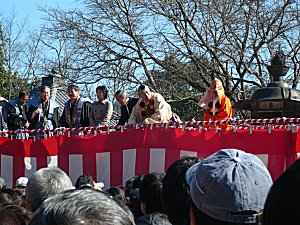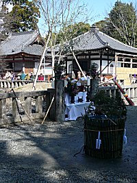 さて、堂内での行事が済んだあとは、境内で護摩供養です。本堂の前の「四本桜」の前に、注連縄がはってあって、その中にこんもりと葉っぱを盛った護摩壇が用意されてます。 今度はここで護摩(左側のタルには水が入っています)正面向かって右側は人がいっぱいいたので、左側に移動したら一番前をゲットできました。が…ここは日陰で寒いのだった!(だからこっちがわは人気がなかったのね)しばらく寒い中我慢して待っていたら、堂内にいた山伏さんたちがこちらに移ってこられて、先頭の山伏さんが注連縄内にまじないをして入場。法螺貝を吹き鳴らしながら入ってきました。山伏入場管長入場山伏さんと、管長さんが入場されたのはわかるんだけど、最後に鬼までついてきたよ(笑)鬼登場ついてきて護摩壇の周りを太鼓の音にあわせて踊りまくって、とある一画の椅子が並べてある場所に座ったのには笑った。何故、鬼さまご一行があんなに優遇されてるんだ?鬼さん勢ぞろいそして、いろいろな作法に基づき、準備です。魔物が入ってこないように矢を打って、四方を結界します。破魔矢による結界間近でみると迫力満点すごい勢いで弓を引くので、「当ったら怖いだろうなあ」って思ったけど、絶妙な力加減と、人がいない方へいない方へ打っているようでした。(それでも放たれた矢を取りに行く人もいたけど)次に護摩壇に火をたくために、また秘法。剣で切ったり、指で何かを唱えながら切ったり。こういうの見るのは初めてです。その後、ようやく竹の松明に火がつけられそれが段にくべられて、火がつきます。点火体制点火準備火がつきましたこういうものは煙が黒いとばかり思っていましたが、最初あがった煙は真っ白で、ホイップクリームが立ち上っているかのよう。それが生き物のように、うねうねしたり、蛇行したりして上がります。最初は白い煙がもくもくと風によって煙があちこちするので、山伏が大きな団扇を手にあおって燃え上がりを補助したり、煙が流れないようにしたり。煽って煙をまっすぐにします燃えてきたそのうち、白い煙が少なくなり、壇にかけられた緑の枝が燃え尽きた後は、下に組まれた木々が燃え始めます。そこでようやく、赤い火の手があがって、見慣れている火を焚いている光景になりました。その後は、管長さんが念じながら護摩を投げ入れます。護摩木を投入します燃やしながらもタルに入った水をかけ、必要以上に燃えないようにしている様子。火が燃え始めると、さっきまで寒かったこちら側も赤々と照らされて温かくなります。これだけ離れていても温かい(熱い)のだとしたら、そばで火をうけている山伏さんたちはもっと熱いんだろうな。さっきまでのガタガタ、ブルブルは少し影を潜め、火に照らされて顔が熱くなってきました。護摩木を入れて、燃え上がったら、再び鬼が出てきて、護摩壇を囲んで踊り、そのまま結界を出ていきます。鬼がまたまた踊りますその後、管長さん、山伏さんも退場して、護摩供養は終了。次はいよいよ、お待ちかねの豆まきです。(つづく)