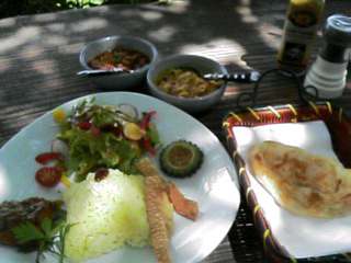 今日で生駒最後の日ってことで、前から行きたいと思っていた『ラッキーガーデン』に行きました。生駒山山頂も近いぞってところへ、徒歩で行ったもんだから、殆んど山登り(汗)汗だくでたどり着いたら、山の風が心地好かったです。今日のランチをチョイスしたら、注文から出て来るまで30分。食後のお茶が出てくるのに15分。時間がないときはオススメできませんが、景色を眺めてればのんびりできるので、OKです。今日のランチはカレー二種類にサラダ、ナン、ゴーヤ、お魚にライス。食後に紅茶で1600円。矢田丘陵より高く、奈良高原までも見える位置なので涼しい所でした。(どうせ暑いからてんで、半袖でもいいかと思ったけど、かなり風が涼しくて、長袖の服で行ってよかった)生駒宝山寺参詣の際に足を伸ばしてはいかがでしょうか?(南生駒方面から徒歩で行くよりも、宝山寺から山中を徒歩のほうが、なんぼか楽です(汗)←どちらも体験したからわかる)