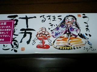 十万石饅頭、です。某番組でも有名(?)な、埼玉銘菓の十万石饅頭。埼玉に講演会聴きに毎月行ってるから、いつ買ってくるかいつ買ってくるかとダンナは楽しみにしていたらしい。しかし、私が行っている駅周辺には売ってなくて、このたび、決意して帰りに大宮まで行っちゃいましたよ(笑)そして目出度く駅中でゲット。これが、その、十万石饅頭です。 ダイナミックな絵は、棟方志功大先生の手によるもの。先生が「うまい!うますぎる!」って大絶賛したんでしょ?ナマモノだから中を早くあけて確認して食べてってあったから慌てて開いてみたのですが、完全個別包装してありました。な~んだ、そんなに慌てなくてもよかったのか。 中は私好みのこしあんで、皮もしっとり。ごっつぁんでした♪