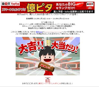 2012年最後の当たりは、楽天totoくじでした。すごいびっくり!おみくじをフライングで引いたら「大当たり」といっても1ポイントだけなんですけどね★今年もたくさんポイントいただきました。来年もたくさんポイントもらえますように(^^)それでは皆様良いお年を!(って、もう明けたワケだが…)