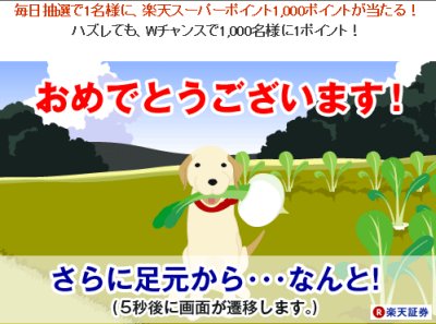 今日のカブは美味しかったようですよ♪★【楽天証券ラッキー「カブ」くじ】━━━━━━━━━━━━━━━━━━━━━━━━━━━━━━━━━━━━━━ ★おめでとうございます!★ 楽天証券ラッキー「カブ」くじ ご当選のお知らせ━━━━━━━━━━━━━━━━━━━━━━━━━━━━━━━━━━━━━━たまに珍しいものが当たるので、ウカウカしてられないのだな。たまには、カブでも食べてみようか(笑)毎日こつこつポイントゲット~♪
