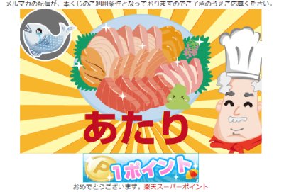 今日はダブルであたりでした。まずは、楽天レンタルラッキーくじがあたり。━━━━━━━━━━━━━━━━━━━━━━===========================★★ 楽天レンタルラッキーくじ ★★===========================━━━━━━━━━━━━━━━━━━━━━━◇◇おめでとうございます◇◇~ ご当選のお知らせ ~━━━━━━━━━━━━━━━━━━━━━━久しぶりに「777」がそろっちゃいましたよ。うきゃきゃと思っていたら、Infoseekでは「111」が出ました。━━━━━━━━━━━━━━━━━━━━━━━====================================== ★★★ Infoseek ラッキーくじ ★★★====================================== -------------------------------------- ☆☆☆\ おめでとうございます /☆☆☆ ~ 1ポイントご当選のお知らせ ~ ━━━━━━━━━━━━━━━━━━━━━━━今日で、6月もおしまい。今年も半分終わっちゃいました(涙)あっという間に、一年の半分も過ごしちゃいましたか。うーん。年とると1年早いわ~。残り半分も、ポイントゲットしちゃうぞ、と。毎日こつこつポイントゲット~♪