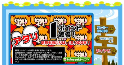 今日は、Infoseekが当たりです。━━━━━━━━━━━━━━━━━━━━==========================★★★ Infoseek ラッキーくじ ★★★==========================---------------------------------☆☆☆\ おめでとうございます /☆☆☆~ 1ポイントご当選のお知らせ ~━━━━━━━━━━━━━━━━━━━━「333」であたりでした~。なんだか、最近あたりまくってる?毎日こつこつポイントゲット~♪
