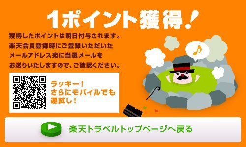 今日も当たりが出ました~。温泉ダイブ、成功です★━━━━━━━━━━━━━━━━━━━━===========================★★ トラベル版ラッキーくじ ★★===========================---------------------------------~ ご当選のお知らせ ~━━━━━━━━━━━━━━━━━━━━大雨降って、ちょっとだけ肌寒い…かと思いましたが、蒸してきた感じがする今日この頃。温泉に入らなくても、そろそろサウナ状態の夏が来るなあ…とか思うと、ユーウツな梅雨でございます。そろそろ夏本番。うちのショートニングが柔らかくなってきました(笑)そろそろ冷蔵庫入れないといかんなあ。毎日こつこつポイントゲット~。