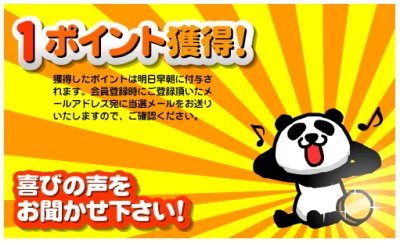 今日はダブルで当たりです。まずはパンダちゃんが踊りました。━━━━━━━━━━━━━━━━━━━━━━===========================★★ 楽天ラッキーくじ ★★===========================-------------------------------------◇◇おめでとうございます◇◇〜 1ポイントご当選のお知らせ 〜━━━━━━━━━━━━━━━━━━━━━━★そして、infoseekくじもあたり♪━━━━━━━━━━━━━━━━━━━==========================★★★ Infoseek ラッキーくじ ★★★==========================---------------------------------☆☆☆\ おめでとうございます /☆☆☆~ 1ポイントご当選のお知らせ ~━━━━━━━━━━━━━━━━━━━(何のぞろ目かは忘れちゃったわ…リアルタイムで更新しないもんで)★今月は真面目に(?)くじをしているせいか、アタリがいつもより多く感じます。やはり継続は力なりなのかも。毎日こつこつポイントゲット~。