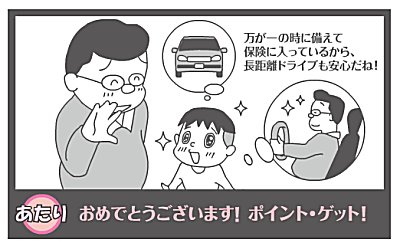 今日は保険で新しいパターンが当たりました♪━━━━━━━━━━━━━━━━━━━━━===========================★★ 楽天の保険ラッキーくじ ★★===========================-----------------------------------◇◇おめでとうございます◇◇~ ご当選のお知らせ ~━━━━━━━━━━━━━━━━━━━━━「ドライブ」に行くと…いつも追突事故を起こす一家なのですが、今回は何故か大丈夫だったようで、「保険に入っていてよかったね」というオチらしいです。【楽天スーパーSALE】ハローキティ キティとドライブ サイトウジャパン P01Jun14保険のくじは、これで三つ(?)制覇したのかな?次はお買い物編でもアタリが出て欲しいぞと。そのためにも毎日コツコツポイントゲット~♪
