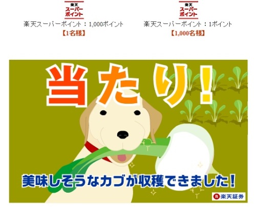 今日はカブが美味しかったそうです(^^)【楽天証券ラッキー「カブ」くじ】━━━━━━━━━━━━━━━━━━━━━━━━━━━━━━━━━━━━━━★おめでとうございます!★ 楽天証券ラッキー「カブ」くじ ご当選のお知らせ━━━━━━━━━━━━━━━━━━━━━━━━━━━━━━━━━━━━━━日付が変わろうとしている頃に、あ!やってない!!と慌ててやったら、当たりました♪諦めないことは大切ですね。毎日こつこつポイントゲット~♪