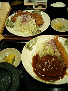 昼飯に味噌ダレかつとハンバーグ&エビフライ。