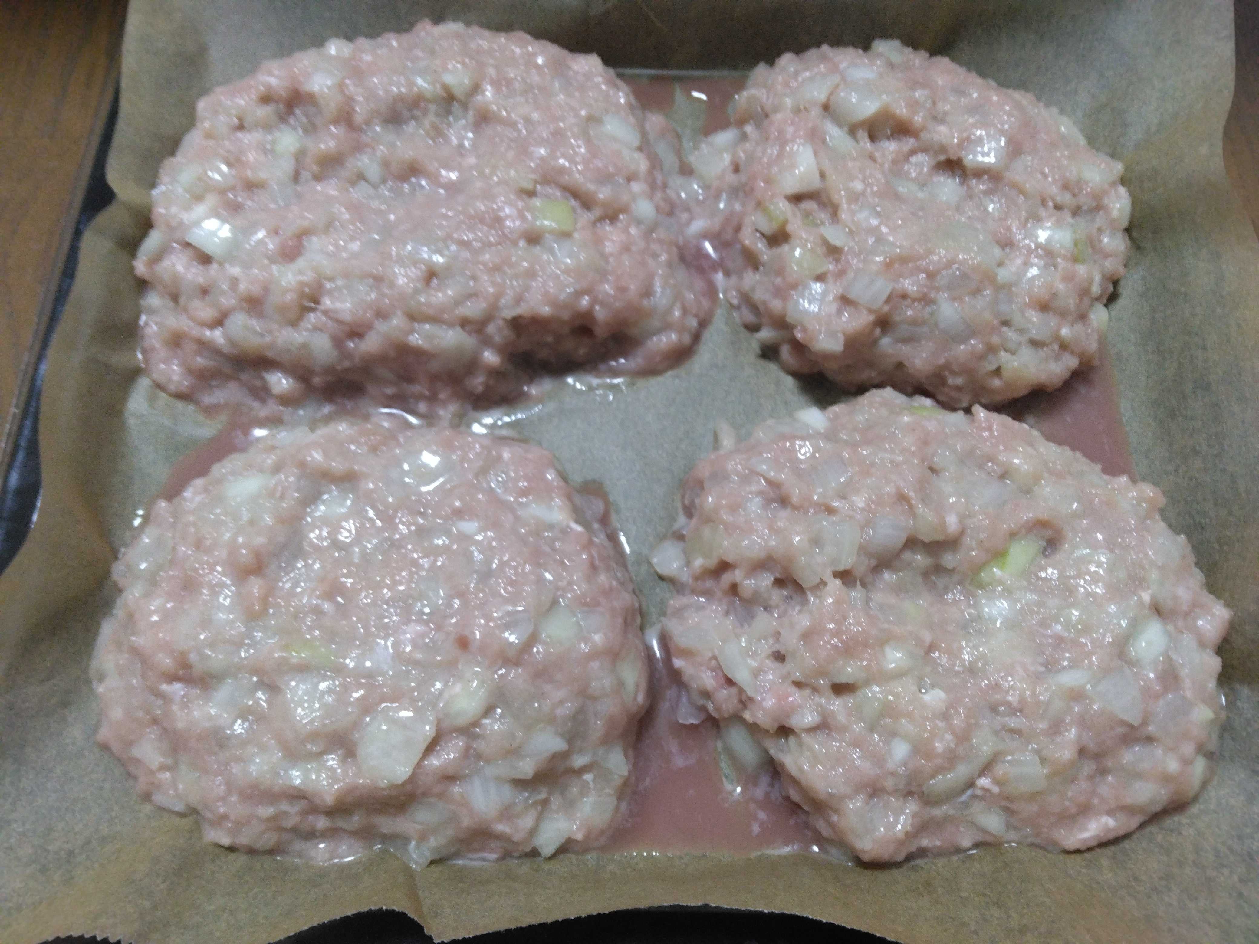 オーブンでハンバーグを作りました玉ねぎをみじん切りにしてガラスボウルに入れて米油を少量加えてレンジで温めました別のボウルに牛乳 大さじ3杯パン粉 大さじ3杯を入れてかき混ぜてから豚ひき肉 400g塩コショウ 少量先ほどの玉ねぎのみじん切りを加えて揉み込みましたオーブン用のトレーにクッキングシートを敷いてハンバーグの種を成形して並べましたオーブンで220℃で25分焼いて完成ですポン酢をかけて美味しくいただけました