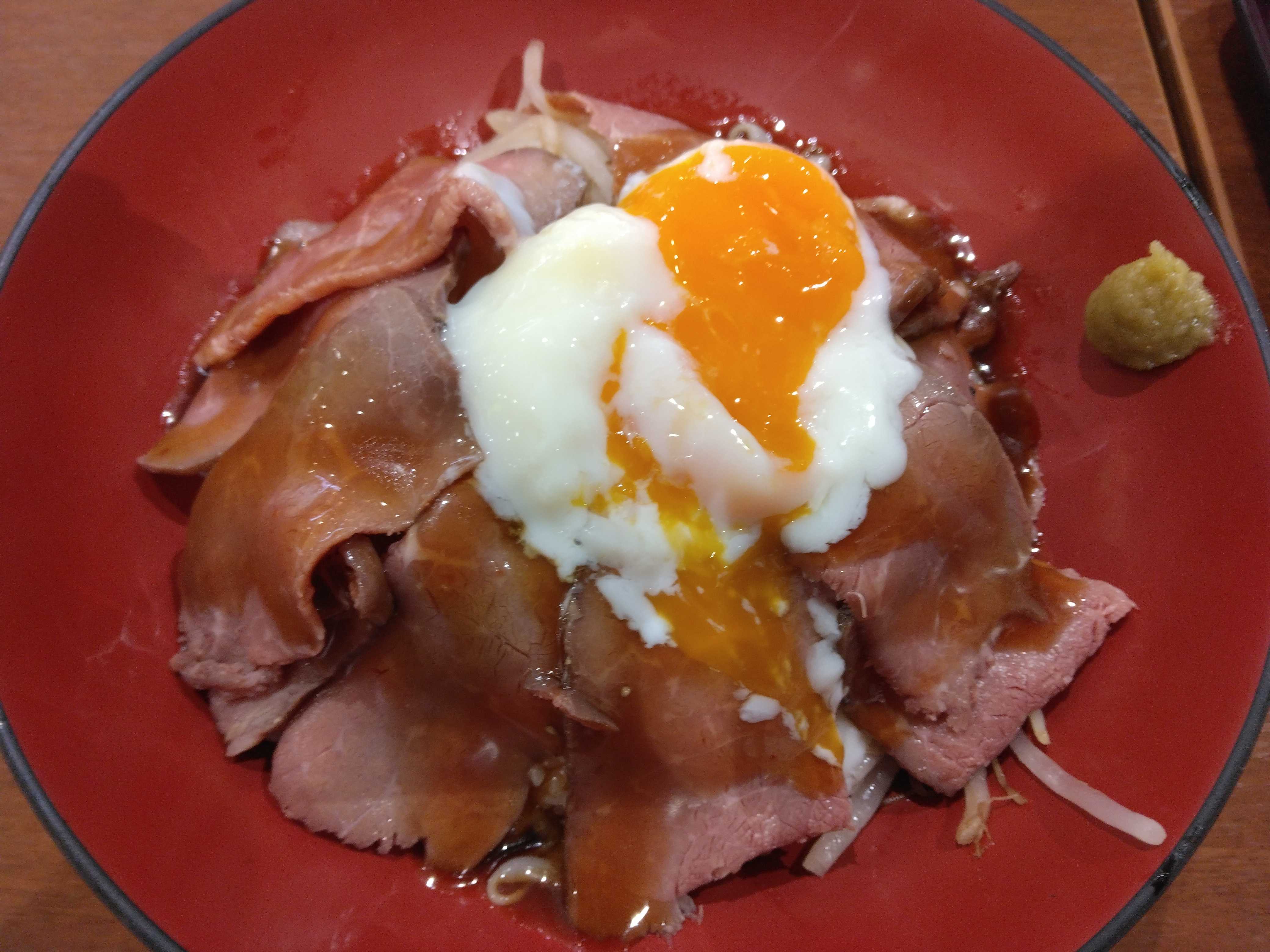 柿安Meat Expressでローストビーフ丼をいただきましたご飯の上にもやしと甘辛いタレがかかったローストビーフと温玉が乗っていましたサッパリとしていて食べやすくて美味しかったです