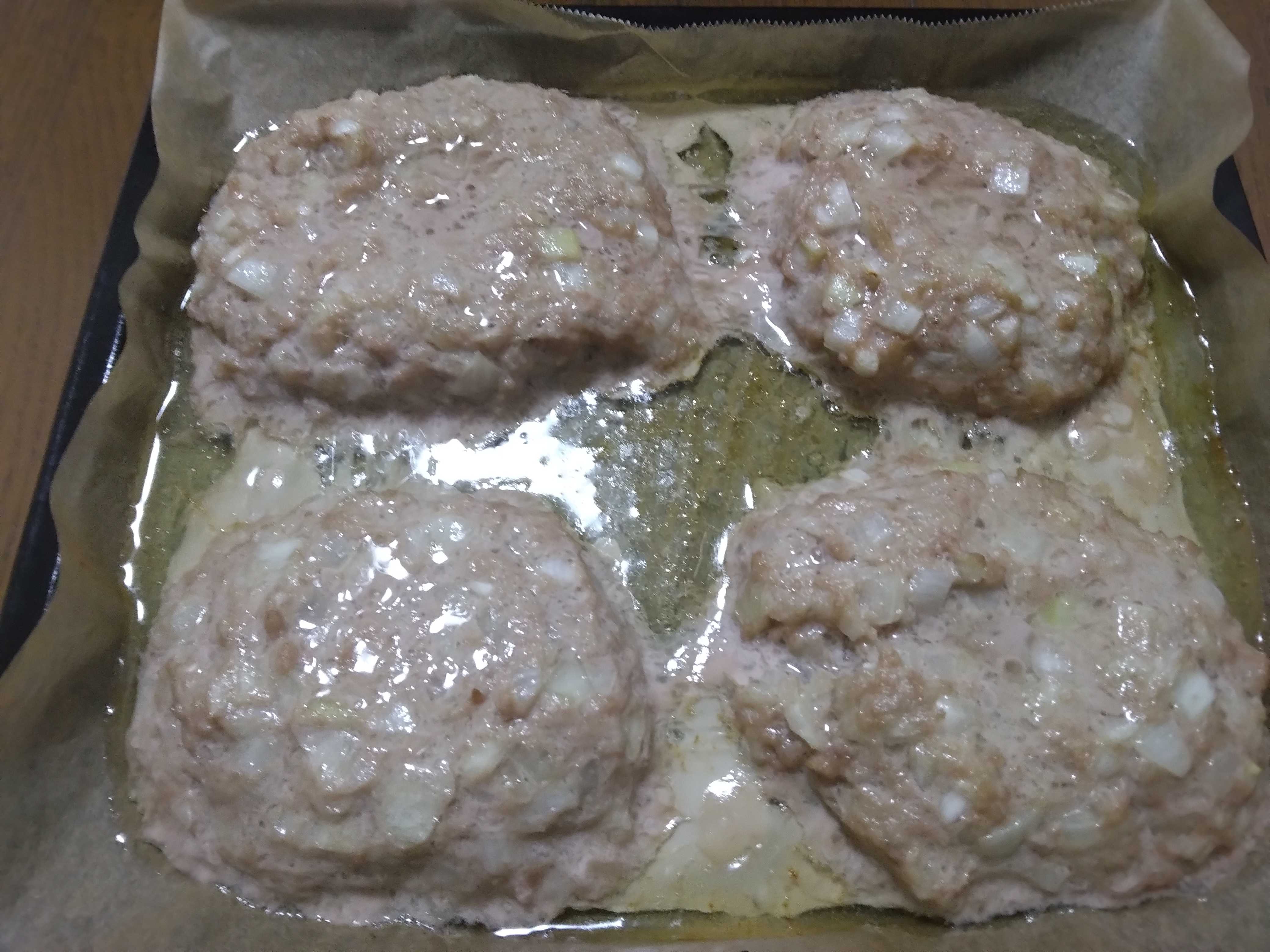 オーブン用のトレーにクッキングシートを敷いてハンバーグの種を成形して並べました