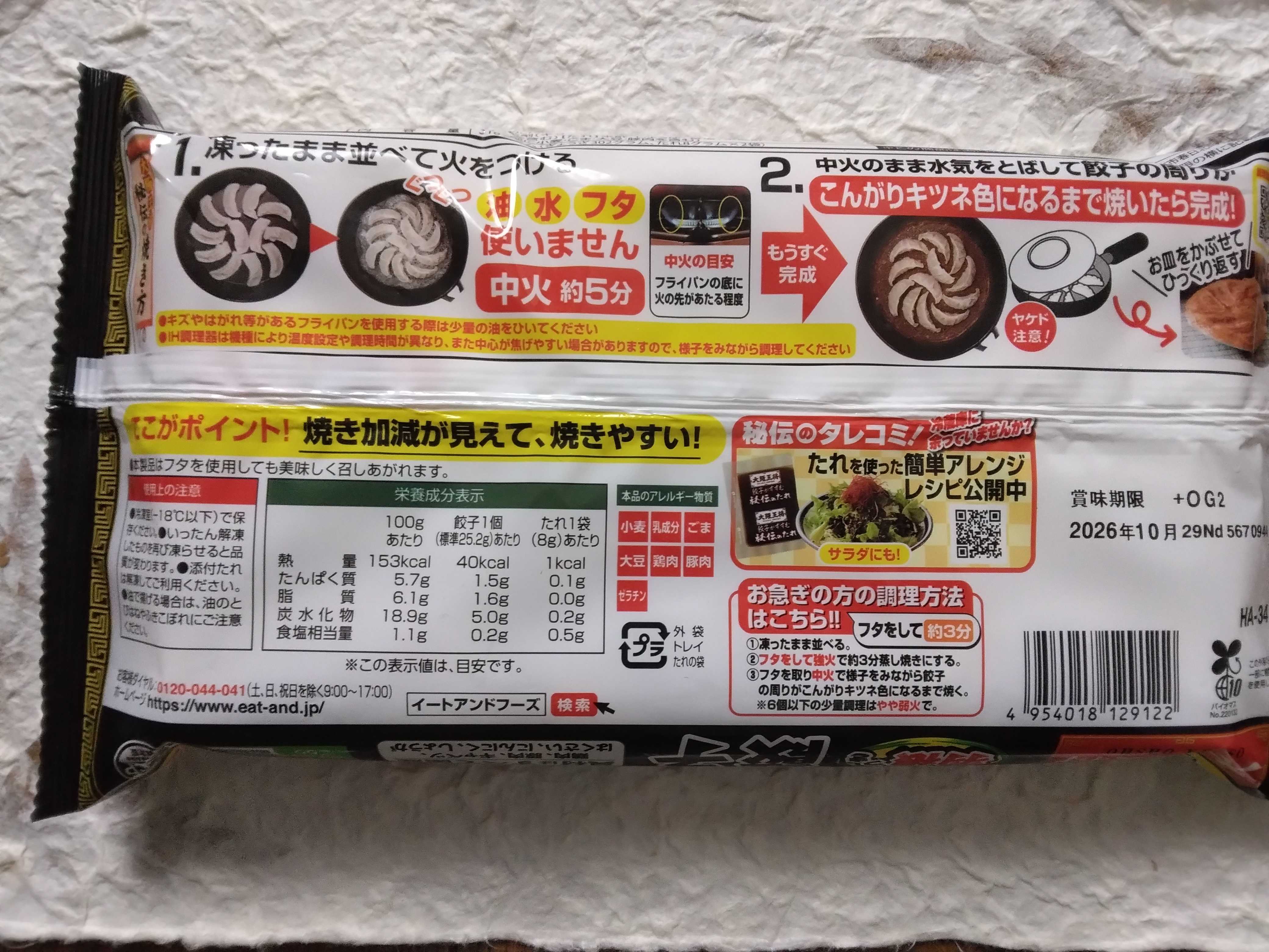 フライパンに凍ったままの餃子を並べて焼きました餃子にお皿を被せてひっくり返すときれいに羽根がついた状態で取り出せました具材は全て国産みたいで美味しかったです