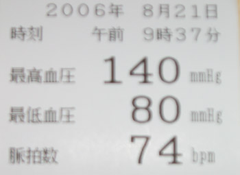 今日は3ヶ月に一度の薬を貰いに病院へ行って来た。”今日は血圧計ります”と言われたので腕を台の上に載せて・・・・・”ゆっくり深呼吸してください”はぁー・・・・ハァー・・・・はぁー・・・・・ハァー・・・・・140mmhgありますけどいま緊張されていますか? ( ̄□ ̄;)!!女医さんだったのに・・・・・・白衣高血圧かもしれないと言われた。それって、病院では高血圧になるってこと???会計を済ませ、ど~も納得いかなかったので、待合室に置いてある自動血圧計にもう一度、腕を入れてみた。やっぱり同じだった。(>_