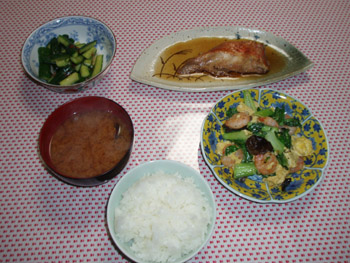 今夜の我が家の夕食です。 寂しいかも?3日ぶりの休みだったので久々に、18時からバイトがある長女の夕食を作りました。メニューは金目鯛の煮付けエビと青梗菜の卵とじ青梗菜が2束98円だったので4束と残りものの乾燥きくらげ。あとはアクセントに特売品のエビに卵。金目鯛はCOOPの宅配の冷凍品を酒、砂糖、しょうゆ、みりんで煮付けました。はっきり言って味付けは適当です。味噌汁は普段使っているマ●コメ料亭の味。今使っているのは何だか赤味噌が強いのか赤だしに見えるけど?夏場だから???明日はまた夫婦で出かけるため夕飯を作りません。子供達よ・・・・・・・・・・・・m(__)m