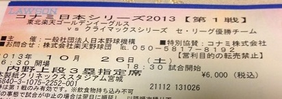 とうとうやってきましたよ。日本シリーズ。夢の大舞台です。ところで,今週はこれでもかというくらい忙しく,せっかくのCS勝ち抜けやドラフトなどの大イベントも傍観するのみ(TT)それにしても,ロッテを下したゲームはすごかった(みたい)ですね~。うーん,見たかった…。おそらく,Kスタで見ていたら一生忘れられない想い出になったでしょう。そして,昨日のドラフト。正直,朝のニュースで,あ,今日だったんだ,と気づく始末。しかし,前評判随一の松井を取れるなんて。勢いあり過ぎですね。そして,社長のヒキの強さにもびっくりです。今年は宮城の選手もたくさん取りました。ぜひ,活躍してほしいものです。特に岩出山高校の今野君には頑張ってほしいなぁ。さて,本題ですが,明日の日本シリーズ第1戦。先発はなんと則本でした。田中の疲労に配慮という話もありますが,どうなんでしょう。いずれにしても,則本は初戦の先発という大役を任されました。これをプレッシャーと感じず,スタンドの歓声を背に思いっきり自分を出してほしい。そして,私も何とか明日のチケットを手に入れることができました。ローチケでまぐれあたり。行けるかどうか怪しかったけど,何とか行けそう。天気も大丈夫みたいですし。家族4人で楽しんできます。もし、よろしかったら…クリックを。にほんブログ村
