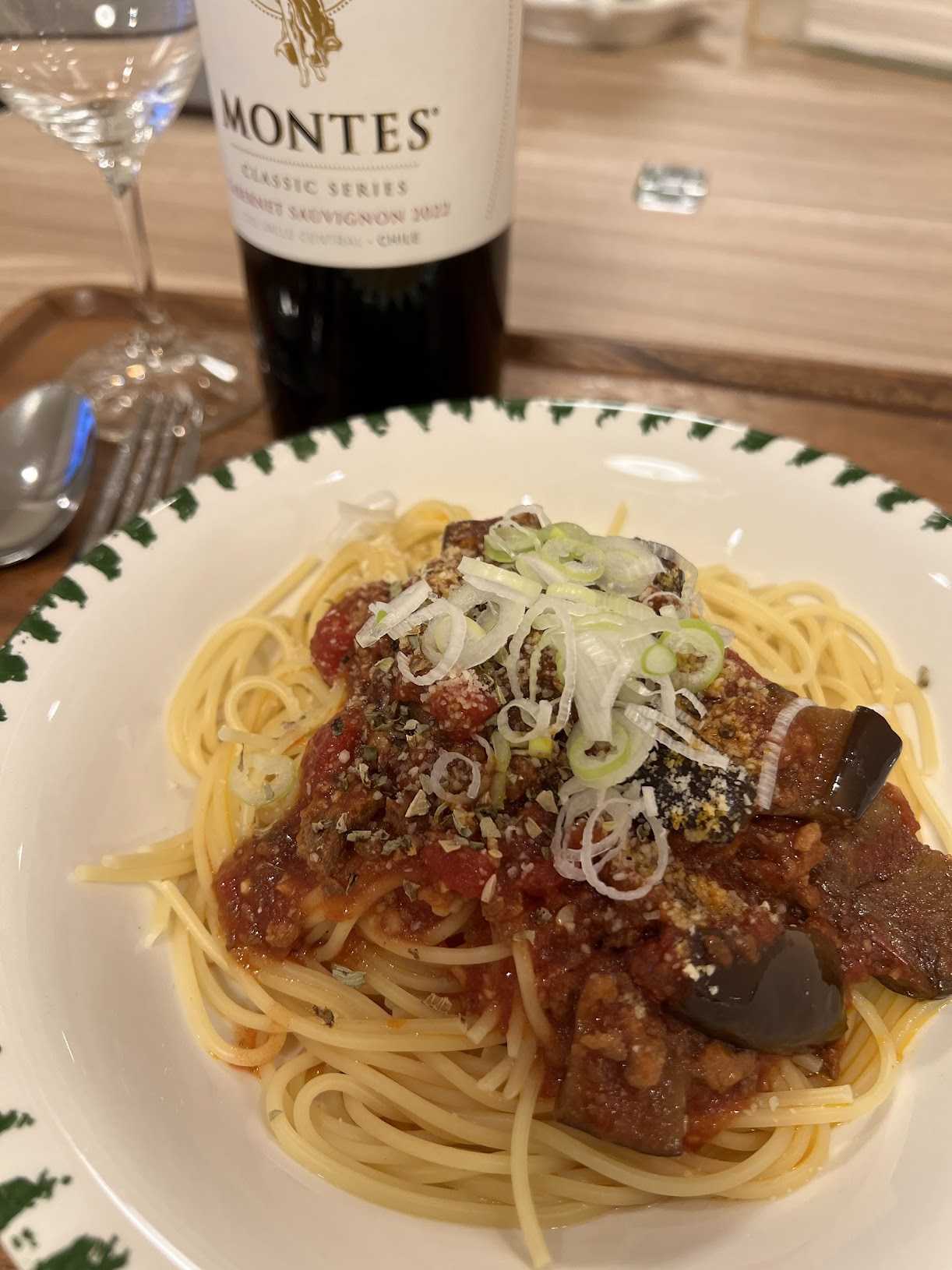 夜は「なすと辛味のひき肉スパゲティ」にしました。