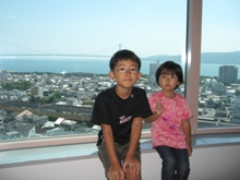 今日のこうっぺヤフーオークションで招待券(大人2枚分)を半額で落札していたので(笑)、“明石市立天文科学館”に行ってきました!プラネタリウムは西脇の“テラ・ドーム”でも見たことがありますが、ここ明石のプラネタリウムの方が本格的で大きかったです。今日のプラネタリウムは「個性たっぷり太陽系の衛星たち」という内容で、星を見ながら星座や各衛星の説明を聞きました。ちょっと難しい説明もありましたが、家にある図鑑でしっかり復習しようと思います。右の写真は14階の展望室から、明石海峡大橋と淡路島を背景に撮影したものです。この展望室から夜景を見たら素敵だろうなぁって思いましたが、開館時間は午後5時までなんですって。ちなみに高所恐怖症のパパはガラス面の方(外側)へは一歩も寄らず、内側をびくびくしながら移動していました(笑)。