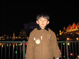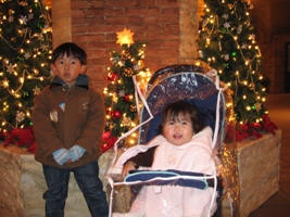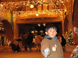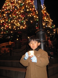 2006年12月3日東京ディズニーシー(17)~過去のディズニーリーゾート旅行の“こうっぺ&ゆきっぺ記念写真”を紹介~“アメリカンウーターフロント”にて。大きなツリーの下で、スーベニアプリン(アイス?)を買ってもらって。※旅行記→コチラ
