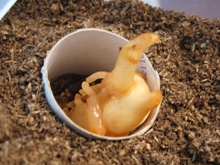 今日のかつっぺこの一週間、蛹化直前のカブトムシの幼虫の世話で大忙しでした。少し小さなプラケースに小分けに入れていたのですが、マットの固さが十分でなかったらしく、毎日毎日ゴロゴロとマット上に出てきてしまっていたのです。そこで、一番安定感のある育成マットを購入し、下部をしっかり固めた新居へ移動。何匹かは観察用に100円ショップで買ったガラス瓶へ、残りはプラケースに。両方とも、幼虫たちは大喜びで潜って、早速蛹室作りに励んでいました。そして、もうかなりぶよぶよしてきていた蛹化直前の幼虫2匹は、トイレットペーパーの芯で作った人工蛹室へ。その人工蛹室に入れて5日目の今朝、なんと一匹が蛹に変身していました!感動しました!あとは無事に羽化してくれるのを祈るだけです。頑張って無事成虫になってねカブくん!