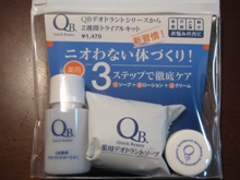 QB薬用デオドラントシリーズの「ソープ・ローション・クリーム」のミニサイズが入ったお試しセット。“体臭等のニオイの原因となっている雑菌の繁殖、汗と雑菌の結合自体を防ぎ、ニオイの原因を元からブロックします”ですって。