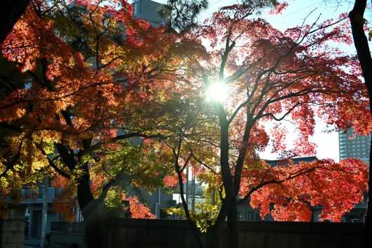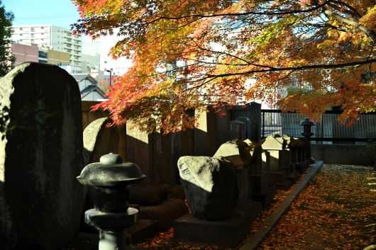 緑道を1ブロック分歩くと交差する道の右手に塀からあふれるようなモミジが紅葉しているのが見える。正楽寺である。北の裏門辺りには数人がカメラを持って出たり入ったりしている。私も急いでその門から中に入る。道路沿いの塀に沿って墓石、石塔が並んでいて、そのうえを広葉樹が覆っている。西に傾き始めた太陽の日が当たって輝く部分と翳っている部分がいい塩梅である。