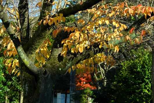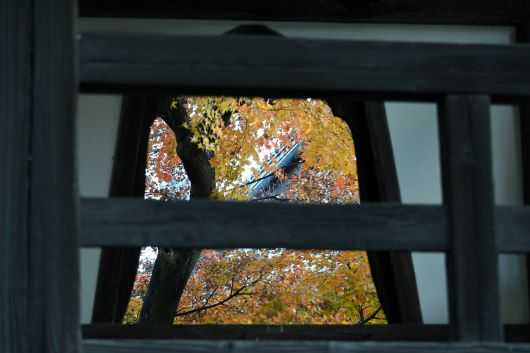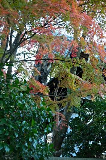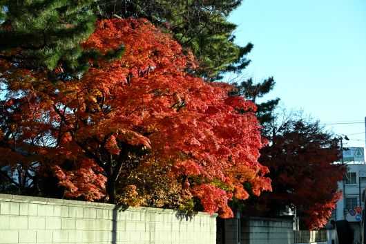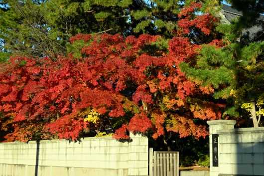 帰り道、正楽寺の東門の前を通ったので、私を寺に誘い入れた塀越しの紅葉を写真に収めた。