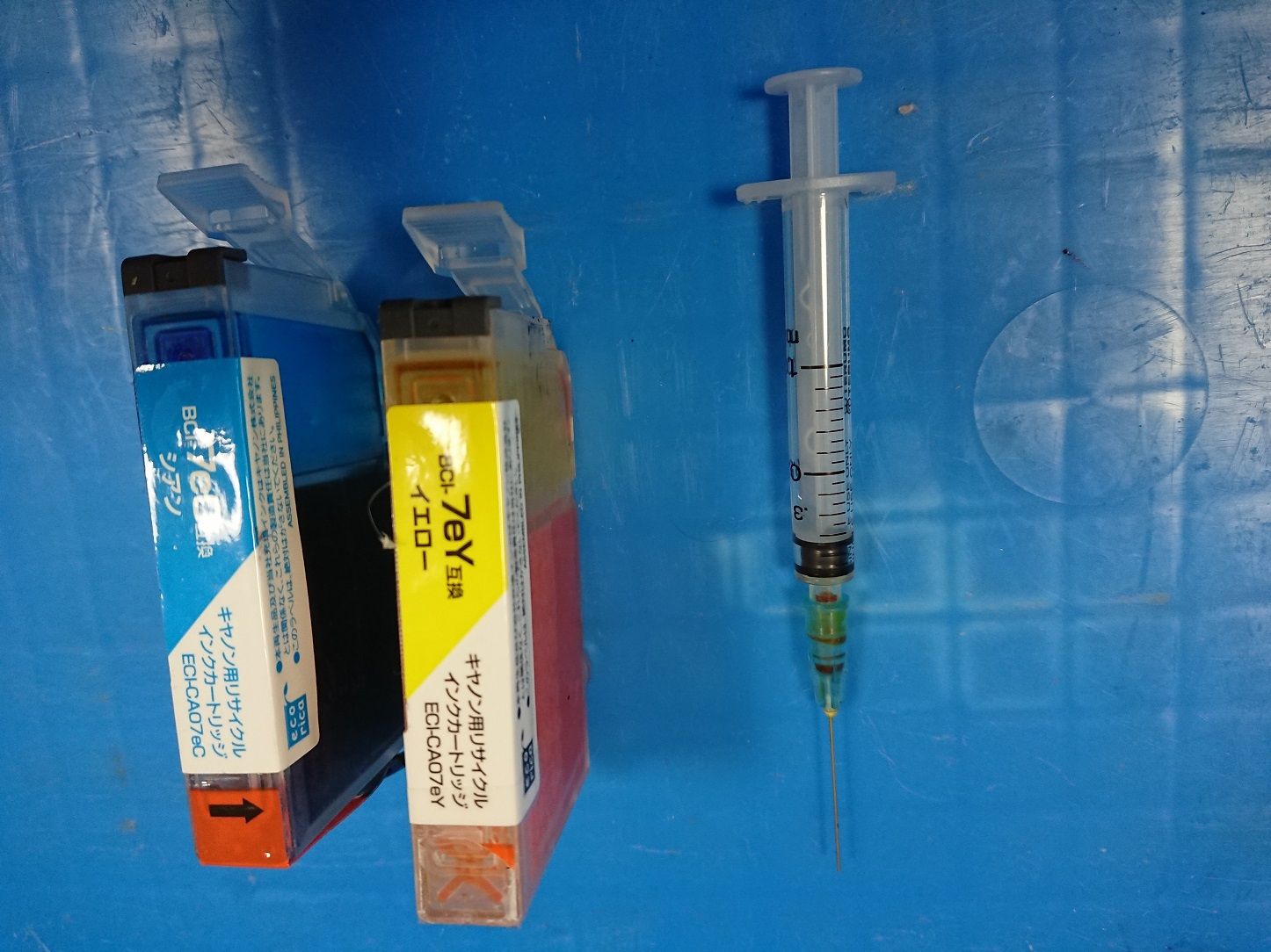こんばんは。年賀状を印刷しようとすると、インクが無い。1個古いプリンターのインク在庫がある。よし!入れ替えしてみよう。昔にプリンター用のインクをボトルで買って詰め替えてた。最近のはそんなの出来ないようになってる。なせば成る!まず、インクのスポンジ露出部を漏れないようテープで蓋をする。ニードルをロウソクの火であぶって、穴を開ける。そこから注射器で吸い取る。同様に空のカートリッジに穴を開けておく。空のカートリッジに注射器で注入する。と、その時。悲劇が起こる。この注射器・・プラリペア用だったんです。針部分に特殊な加工がしてあって、側面にも穴があるんです。もう7~8年さわってません。すっかり忘れてます。もうお気づきだと思いますが、あらぬ方向へぴゅ~っと、トレイを飛び越え寂しい状況に。手はインクだらけ。洗ってもなかなか落ちないし。まあ気を取り直して移し替え。開けた注入穴をテープでふさいでから、スポンジ部のテープをそ~と取って終了。この順番を間違えすると悪夢がおきます。ダダ漏れます。かなり久しぶりに電化製品量販店に行ってみました。8Kテレビ90万! 洗濯機30万! ありえん。そんな高額商品がありましたよ。純正プリンターインク 7千円! ありえん。プリンター買えるよ(`Д´)互換インク¥1500送料込 ポチッときました。電気屋でも福袋。確かに今ちょうど求めてるならお得ですね。インクの福袋はありませんでした^^丸亀製麺でも福袋。1週間うどんは勘弁。福袋大好きなカワセミに値下げしたころに買ってあげよう!なんと不届きな奴になりつつあります。