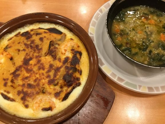 レンズ豆と小麦のミネストローネスープ、エビとイカのドリアにセットドリンクバーを付けて 988円。1,000円の優待券で支払い。