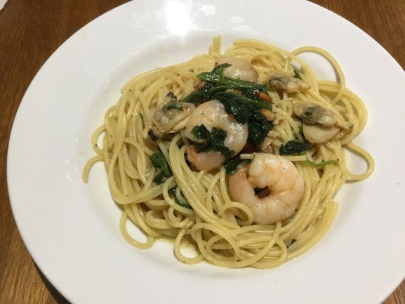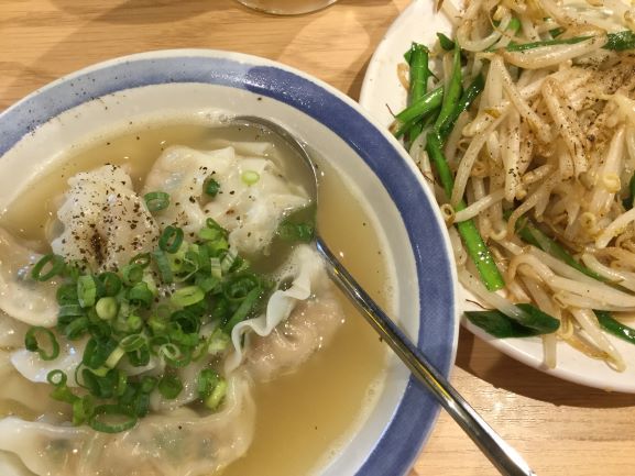 炊き水餃子、山盛り宮しいもやし炒めに生ビールで 1,040円。優待ポイントで支払い。