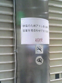 いつもどおり埼京線が止まった時には、全くこの路線はいつもいつもブログのネタに事欠かない線だと思っていたら、実は埼京線どころか、首都圏全部が大変なことになっていた。池袋で埼京線がいつもどおり先詰まりし、いつもの車輌故障かドア故障か急病人かお客様混雑だろうと思い、それにしては妙に動かないので、しょうがないなぁと思いつつ山手線に乗り換え。埼京線はお盆のおかげもあって奇跡のように空いていたのに、山手線は何故か激混み。結構余裕もって出たはずが、恵比寿に着いたときにはもうギリギリの時刻。ホームから飛び出して改札へ行ったらば、改札口が真っ暗。お盆ということもあって普段より混雑はなかったのだが、そのせいもあってか異様な雰囲気が駅、そして駅周辺を包んでいた。なんか何処からか非常ベルの音するし。自動改札は何とか動いていたので飛び出したら、周辺の店の殆どが閉まっている。この店お盆休みだったっけ?などと思いつつ(←この時点でも状況把握していなかった)走りに走って汗みどろで会社に到着したらば、いつもの自動ドアが開かない。何とか通用口から入ったものの、エレベータは動かない。さらに汗みどろになって7階まで階段を走って登ったら、廊下も真っ暗。オフィスの照明は何とかついていたが、クーラーがついていなかった。そしてそのままの状態で仕事……もうorzなんてもんじゃないよもうもうもうコノヤロー。ヤケでこんなの貼ってみる。↓よく知らないのだが、当然大パニックモノなんだよな?大停電ネタにした小さなロマンスだの夫婦愛の確認だのとかいう話じゃないだろうな?ケンカ中のカップルが止まったエレベーターに閉じ込められて仲直りとか、そんなヌルイ話じゃないだろうな?大停電ってそんな生易しいもんじゃないよ? 特に平日の朝のは。今日はたまたま夏休みという人が多かったから良かったが、これがいつものラッシュ時だったら……以上、被害者(←30万分の1)の愚痴でした。