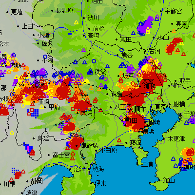 本日の南関東方面の雷。10秒に1度爆撃が来るというすさまじさ。何度来られても恐いもんは恐い。PCのコンセント抜いてLANケーブルも切っておいたが、それでも不安だった……(ll´д`)ちなみに下のは、本日13時14時近辺の雷レーダーの画像です。 ………((((((((;゚Д゚))))))))もう少し経過したらこの赤いのが一気に津波のごとく南へ移動していたんだが、コミケ参加の皆様は無事だったのだろうか。ビッグサイト以前は、参加者の中に陰陽師がいるのでコミケ開催中は不思議と雨も嵐も来ないという噂があったもんだが、今はどうなんだろう。今後の対策のために、雷防止用グッズまとめて紹介。ああそうさヤケだよコノヤロー。↓