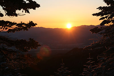 ↓八ヶ岳の初日の出異国情緒あふれる写真と旅行記|KaycomDESIGNより2009年元旦6時の朝食に合わせて、5時45分ごろ起床。といっても、布団から出たのがその時間で、目はすっかり覚めていました。朝食はおせち風で、栗きんとんや昆布じめ、お雑煮などで、やっぱりちょっと物足りなかったです。黒百合ヒュッテの朝食食事を終え、初日の出を見るために中山峠へ向かいました。小屋の人の話では、今日の日の出は6時48分ころ。ちょっとギリギリでしたが、ダメもとで行ってみました。天気は快晴で、小屋周辺からは雲ひとつ見えません。これなら初日の出を拝めそうです。5分ほどで中山峠に到着。すでに10人くらいの人が集まっていました。日が昇る方をじっと見ていると、1分もしないうちに、遠くの連なる山々の向こうから真っ赤な太陽が顔を出しました。中山峠からの初日の出間に合った!今年初の朝日は、まぶしい光で私たちをまっすぐに照らし、あたりの空も山もみんな紅色に染めながらゆっくりと昇っていきます。そこにいた人も見事な初日の出に静かに歓声を上げていました。明けましておめでとう。今年もよろしくお願いします。太陽に向かって手を合わせ、写真を数枚撮ってから小屋へと帰りました。次はいよいよ天狗岳への登頂です。去年は天候が悪く、頂上へ登ったものの、真っ白で何も見えませんでした。でも今日は、山頂もくっきりと見え、これなら噂の大パノラマを見ることができるでしょう。大きなザックは小屋へデポし、アイゼンをつけて出発です。アイゼンをつけると、またすぐにへばってしまうかと心配でしたが、去年とは比べ物にならないくらい快調に足が進みます。樹林帯を抜け稜線に出ると、一気に風が強まり冷たい強風が容赦なく体を打ち付けました。何もさえぎるもののない急登をアイゼンを効かせて登って行きますが、今回はトレースもルートもよく確認できて、迷うことはありませんでした。頂上直下の難所も問題なくクリアし、無事登頂成功。黒百合ヒュッテから約1時間で着きました。天狗岳山頂山頂からは期待通り、素晴らしい景色を見ることが出来ました。すでに1組のご夫婦がいましたが、私たちと入れ替わるように下山していったので、今回も貸しきり状態です。西天狗から八ヶ岳の山々、遠くには浅間山まで見渡すことができました。ここも相変わらずの強風でしたが、その風に乗って薄い雲が、朝日に輝きながらサーッと山肌を通り過ぎてゆく姿はなんとも神秘的で、神々しくさえ思うほど美しいものでした。天狗岳山頂から写真をたくさん撮りたかったのですが、数枚撮った時点で、カメラが寒さのあまりご臨終。上着の中に入れて暖めていたのですが、外に出すとすぐに凍死してしまいます。(温まるとまた生き返る)仕方がないので、また上着に入れて下山を開始しました。→人気ブログランキングへ--------------ブータンの写真を掲載しました。→こちらからどうぞ