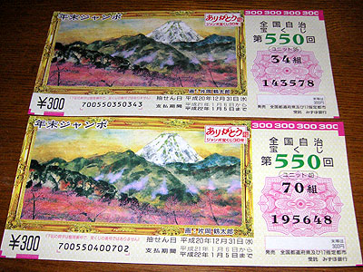 ↓年末ジャンボ当選券異国情緒あふれる写真と旅行記|KaycomDESIGNよりと言っても、5等の3000円ですが・・・実は、宝くじを買うのは今回が初めてで、今年のは、ジャンボ宝くじが30周年記念とかで当たりが多いと聞き、バラ10枚、連番10枚、合計20枚買ってみたのです。販売開始から売り場を探していたのですが、場所や開店時間が合わず、販売最終日に駆け込みで買うことができました。購入後は、買ったからには当たって欲しいので、自分なりにいろいろ考えて、黄色のものが金運にいいと聞いたことがあったので、ちょうど部屋の壁に飾ってあった、チベットでもらった曼荼羅が描いてある黄色の布に挟んでおきました。そして当選番号発表の日。私はそんなことはすっかり忘れて、八ヶ岳に行っていました。(→年越し天狗岳トレッキング記参照)すばらしい初日の出が見れて、今年もいい年になるぞ~と元旦からとてもいい気分です。その日家に帰ってから思い出し、さっそく確認。6等一枚(10枚買えば絶対一枚当たる)、5等一枚、合計3300円の当選でした。元は取れませんでしたが、初めて買ったにしてはGJでしょう。幼いころからクジ運はそこそこ良かったのですが、やはり、こういう大きなものはなかなか当たらないものなんですね~(10万円くらいは簡単に当たると思っていた)でも、買ってから番号を調べ終わるまでは、にわかに希望を抱くことが出来るので、また次も買ってみようかなと思いました。待ってろ私の3億円!(…あ、でも、1万とかでもいいです)→人気ブログランキングへ--------------ブータンの写真を掲載しました。→こちらからどうぞ