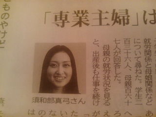 今日の河北新報。興味深い記事だな~と思って読んでいたら、「あれ?この人…」そう!元エンジェルスの須和部ちゃん!須和部ちゃんの研究した“女子大生の母親像”というのが出ていました♪才色兼備とはまさに彼女の事ですね♪久々に須和部ちゃんの顔を見て嬉しくなりました♪元気かな~