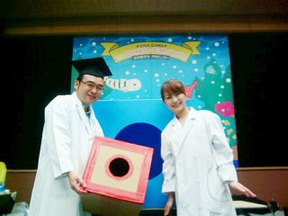 阿部博士と阿部館長さんに囲まれて♪実験楽しかった~コップの水を逆さまにしたり(大気圧)、天使の輪をいっぱい作ったり、遠くのピラミッド倒したり(空気砲)、普通に子供たちと遊んでしまいました(^^ゞまた助手したいな☆