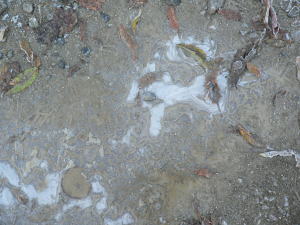 寒い朝でした。最低気温マイナス4℃、水たまりに氷が張り、霜が降りていました。駐車場の水たまりに氷畑の草に霜