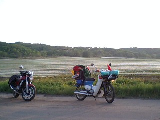霧多布キャンプ場で日が沈み始めた。 小さなログハウス越しに太陽が沈んでいく。 すぐ近くのアゼチ岬まで走ってみた。 あそこなら港が見えるはず! 間に合った。 アゼチ岬からの夕焼けだ。 誰もいない。 今日は赤くはならないな。 夕焼けを独占してからキャンプ場へ戻る。 すると、250ccのバイクが来た。 その人は降りるなり言った。 「君か~、カブで旅してるってのは」 ん??? よくわからない。 「君、有名人だよ」とライダー。 「塘路駅で君にあったという人に聞いてたんだ、カブの兄ちゃんがいるって」 あ、あの夫婦か~。(その時のことはこちら) 有名人って言われるのは初めてだが、悪い気分ではない。 てかかなり嬉しい。 隣にテントを張ったライダー。 俺は飯を炊いて夕食。 飯を食べた後、2人で話す。 関東から来ているそうだ。 パック酒を熱燗にして2人で飲んだ。 少し冷たい空気の中、話しながらの酒はなかなか旨かった。