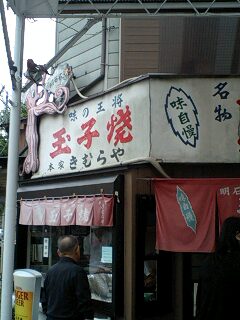 俺が小さな頃、姫路駅の地下にある食堂で明石焼を食べていた。 そこで明石焼を食べるたびに「明石に美味しい店があるんや~」とおかんがいつも言っていたのを覚えている。 ずっと気になっていたのだが、9月に大学の同級生と神戸あたりで遊ぶことになったので行ってみた。 おかんが学生の頃に通っていたということは今の俺よりもおかんが若い時! そんなころから在る店とはどんな店か? 明石駅の南にその店はあった。 ううむ、おかんが学生の時から営業しているだけある。 かなり渋い感じの店だ。 11時前だったのでまだ並ばないですんだ。 明石焼を頼む。 姫路駅の地下で食べていたのよりもやや小ぶりの明石焼が出てきた。 前にしゃれこーべさんオススメの松竹で食べた明石焼もそうだった。 まずは出し汁につけてパクリ。 かなり熱いのでハフハフ言って食べた。 中のとろみ加減が最高だ。 それからソースを塗ってまたまた出し汁につけてパクリ。 俺は食いなれてるソース付きの味の方が好み♪ 食べ終えて店を出ると行列ができ始めていた。 いいタイミングだった。 これから明石に行くと毎回足を運ぶことになりそうだ。