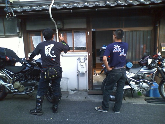さて、出発当日。 急がないと!と思いながらも、モソモソと準備をしていたら突然の訪問者。 二輪熊さんである。 本当は前日のフェリーに乗る予定だったのだが、天候が悪く、1日ずらしたとのこと。 RH峠で昼飯を食べて、午後3時に出発! 2009 北海道ツーリング出発記念♪ たまたま2人のTシャツを並べると、「風 旅人」 笑いながら記念撮影。 さあ、出発! しかし、RH峠を出発後、5分ではぐれた…。 のんびりバイクを走らせながら、「合流ポイントは赤碕の道の駅だな」と思い、道の駅赤碕へ。 すると、やはり休憩中の熊さん♪ 2人の考えは同じだった。 鳥取でフィルム買ったりなんだかんだで、舞鶴に着いたのは22時。 食堂のおばちゃんが今年も弁当を用意していてくれた。 本当にありがたい。 乗船待ちのライダーは20人ほど。 待ち時間に仲良くなった長崎の学生ライダーと3人で2等室に乗り込んだ。 前回の日記 2009 北海道ツーリング! 始動♪