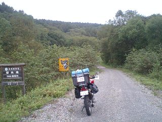 ぽんとの朝。 昨日は朝5時から走りっぱなしだったので今日はゆっくりと。 学生チャリダーを見送ってからのんびり準備。 ぽんとでの一枚 今年は、東北熊さんという方もぽんとによく居るようだ。 さて、今日は九州熊さんと東北熊さんの3人で林道へ!ってことに。 九州熊さんの新車、クロスケが林道を走れるのか?ってのが気になるところだ。 昨日走った別寒辺台林道から分岐しているPF第1基幹林道へ行くことに。 弟子屈から標茶まで走り、いよいよ林道へ。 ジェベルの東北熊さんとSL230の幾三には快走路♪ 今年は、経済性を考え、ブロックタイヤからオンロード用に替えたので、たまに水溜り・ぬかるみで後輪が横に滑るけど。 フラットな林道が多いのでこれでも大丈夫だろう…ということで履いてきた。 ま、のんびり走れたらそれでいいし♪ PF第1基幹林道への分岐に到着した九州熊さん 目的のPF第1基幹林道へ進入するが、道が熊笹に覆われ、走りにくい。 これが晴天ならいいのだろうけど、ポツポツと雨が落ちてきた。 しばらく走ったところで、後ろを走る九州熊さんを待つ。 が、なかなか来ない。 いつもならニコニコしながら汗だくで来る頃なのだが…。 東北熊さんと林に落ちてないか見回しながら引き返してみる。 どこにも居ない。 結局、引き返したのだろうって結論になった。 昼が近かったので、標茶駅前の定食屋で昼飯。 その後、去年いい思いをした阿寒の飽別白水林道へ! 去年は北側からの進入だったので、今年は南側から。 道幅の広い工事箇所を過ぎ、いよいよ!ってところで。 大崩落~! 林道を走ったことがないという東北熊さんに「オススメですよ~」と言ってたんだけどこの有様。 バイクどころか、徒歩でも厳しそう…。 これは…、相当な雨が降ったんだな。 結局、フレベツ白水林道を走り、阿寒の町へ。 セイコーマートで休憩していると雨が。 今日はまた弟子屈へ戻るつもりだった。 雨が止んで、東側の山が見えたところで出発したが、パラパラとまた雨。 晴れているのに雨というなんとも妙な天気だった。 しかし、その妙な天気が幸いしてか、ふと見上げると見事な虹が! はっきりと七色の虹。 こんな虹を見たのは初めてではないか…。 しばらくの間、目の前に架かる七色の橋を見ながら走った。 阿寒横断道路を下る頃には、厚い雲に覆われ、ぽんとに着いた時はずぶ濡れ。 約1時間、寒くて辛かったが、あの虹を見ただけで満足だった。
