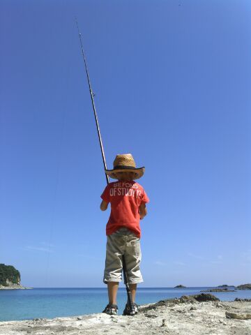 今日は粒男と2人で早起きしてキス釣りに行ってきました! 6時半過ぎにいつもの稲積の浜へ。 竿2本、幾三が投げて粒男は巻く係。 最初は浜から釣ってましたが、1時間ほどでアタリが遠くなったので少し移動して岩の上から。 岩の上は見晴らしが良く、しかもよく釣れるので粒男も気に入ったよう。 「お父さん、竿がプルッとした!」と言うので、ちゃんとアタリも楽しんでいる様子です。 見事な青空。風があったので思ったよりも涼しく過ごしました。 だいぶリールを巻くのも上手になって、後姿だけは釣り師のようです(笑) 餌が無くなっても「もうちょっと釣りたい~」と言ってました。 3時間釣って2人でキス47匹の釣果。 粒男は「キハ47と同じで嬉しいね」と47という数字と列車を絡めて嬉しそう…。 釣りを終えてから海水浴もして、帰りに風呂にも入って充実の半日。 昼からは家に帰って昼寝してダラダラ生活でした。 今夜は今からキスのフライと刺身で夕食です♪