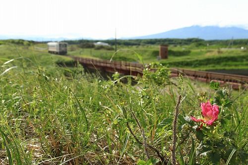 一輪のハマナスを見つけたので、列車を待ち、撮影したがボケすぎ・・・。