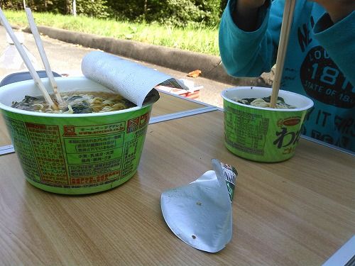 ちょっと早く着いたので親子で大小、同じカップ麺を昼飯に食べました。