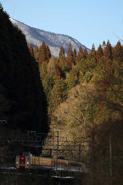 帰り道、伯備線の新郷駅近くでタイミングよく特急やくもが来たので雪山バックで1枚。